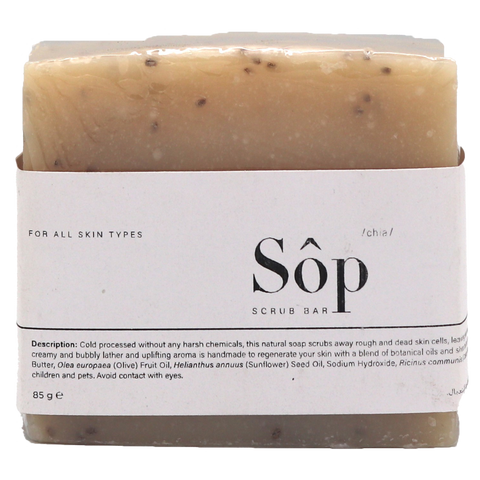 Cold processed without any harsh chemicals, this natural soap scrubs away rough and dead skin cells, leaving skin awash in chia seeds designed to gently exfoliate, soothe and nourish the skin.