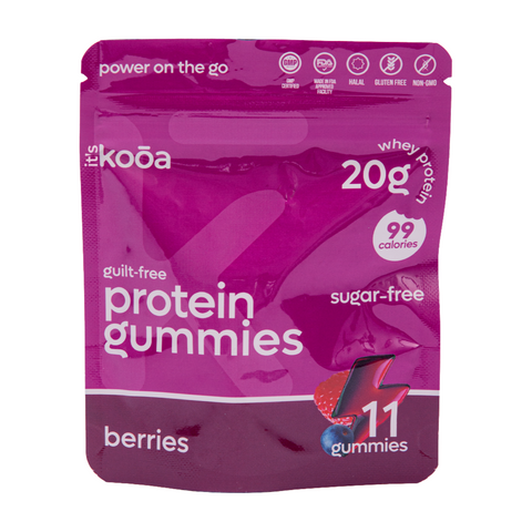 Whey protein gummies, in a refreshing mix berries flavor. Sugar free (sweetened with monk fruits). Each pouch of 11 gummies provides 20g of whey protein for 99 calories. "