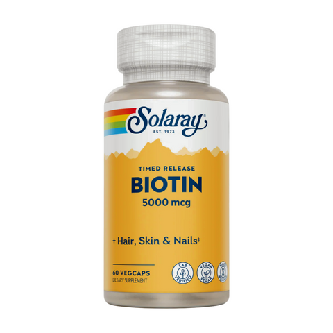 Solaray Timed-Release Biotin is a high-potency supplement containing 5,000 mcg (16,667% DV) of biotin in each 1-VegCap serving. Our two-stage, timed-release formulas are designed to release half of the biotin rapidly and the other half gradually over a period of up to 8 hours, which may help provide sustained support over a longer period of time. With consistent use, Solaray Timed-Release Biotin may help support healthier skin, fuller, shinier hair, and longer, stronger nails.