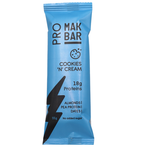 Mak Bar Pro Cookies N' Cream, no added sugar, contains almonds, pea protein and dates.