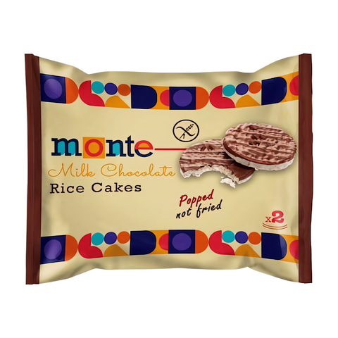 Monte Dark Chocolate Rice Cakes – 32g. Gluten-Free, Popped Not Fried, and Zero Cholesterol. Each Pack Contains 2 Pieces of Chocolate Crunchy Goodness to Elevate Your Snacking Game.