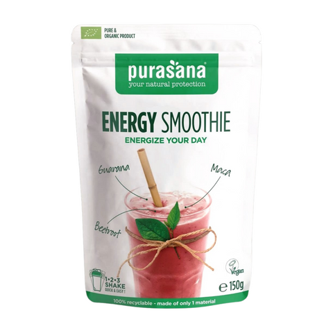 Purasana's Energy Smoothie contains organic ingredients that give you a powerful energy boost. Mix 1 tablespoon with a drink of your choice and your smoothie is ready!