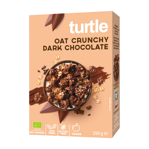 Enjoy a bowl of the Turtle Oat Crunchy Dark Chocolate: a delicious baked chunky muesli with good dark chocolate.